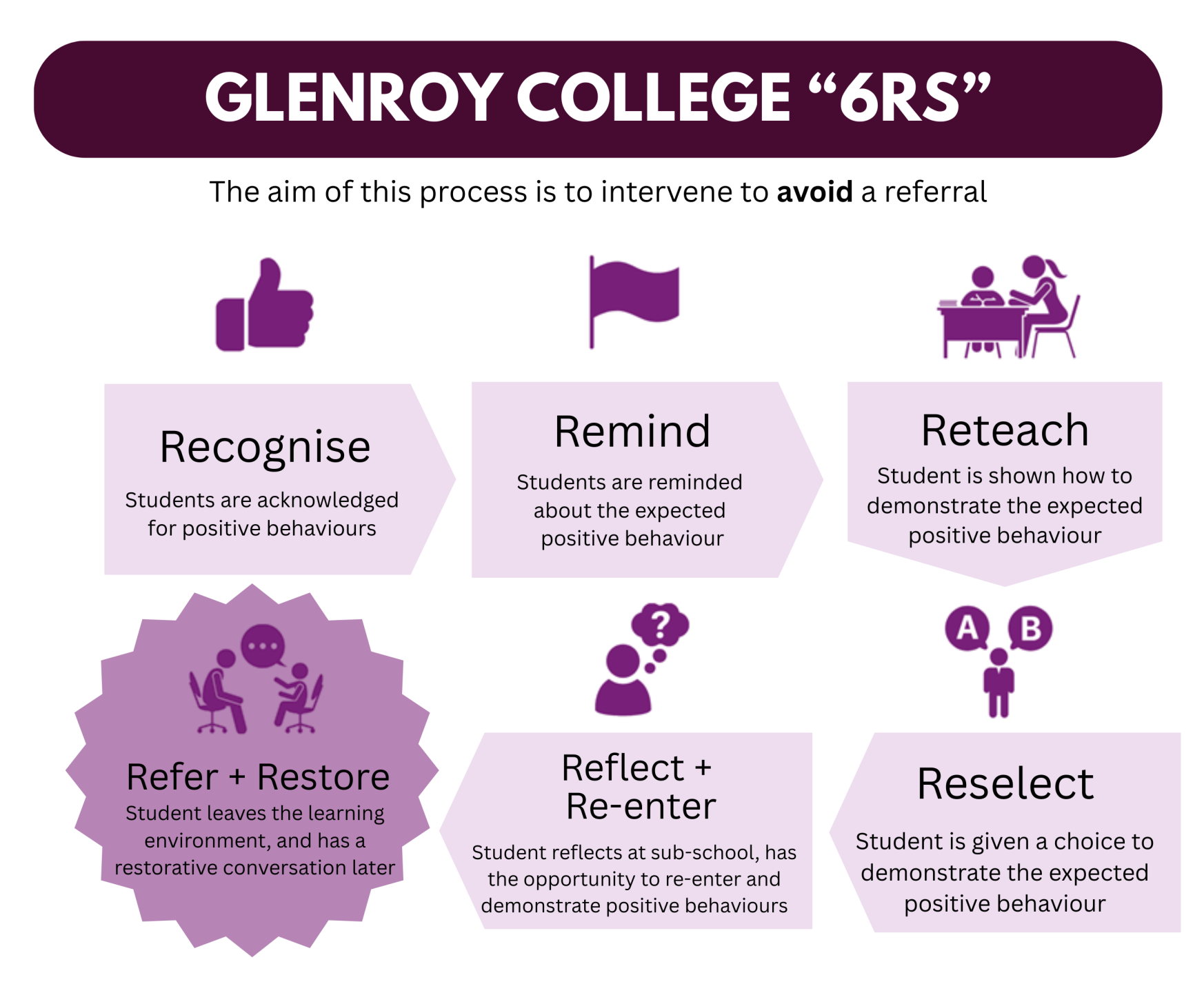 Our 6Rs Process supports students to take responsibility for their behaviour and make positive choices. It is designed to intervene early and help students remain engaged in learning.