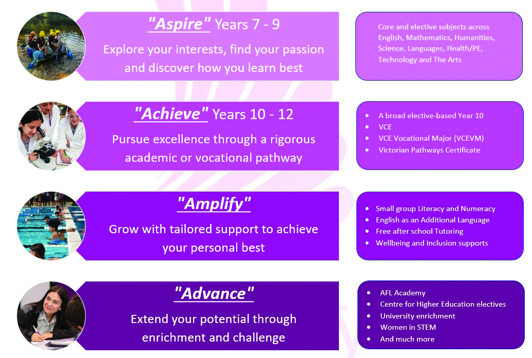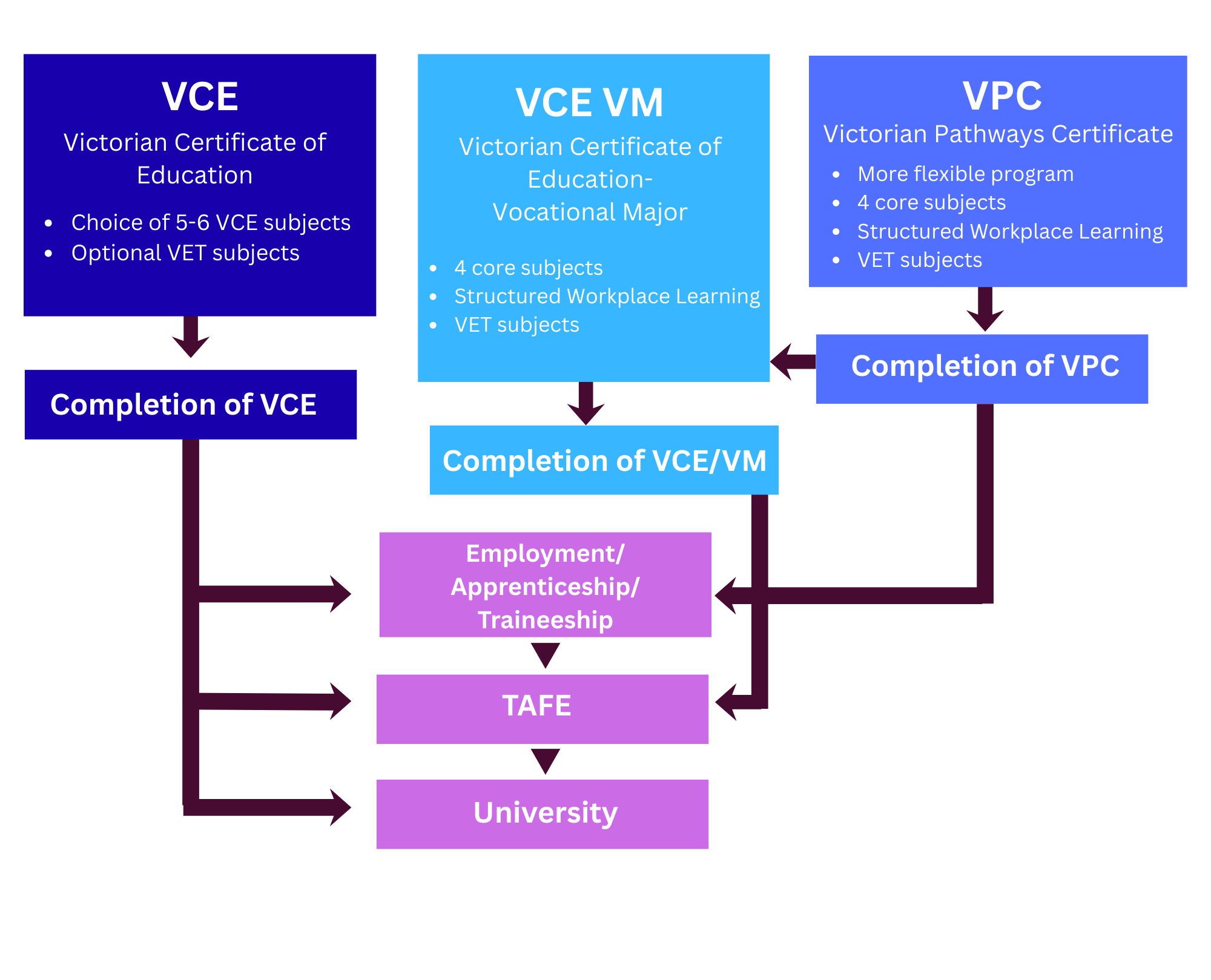 Year 10 offers pathways towards the Victorian Certificate of Education (VCE), the VCE Vocational Major (VCE VM), or the Victorian Pathways Certificate (VPC).